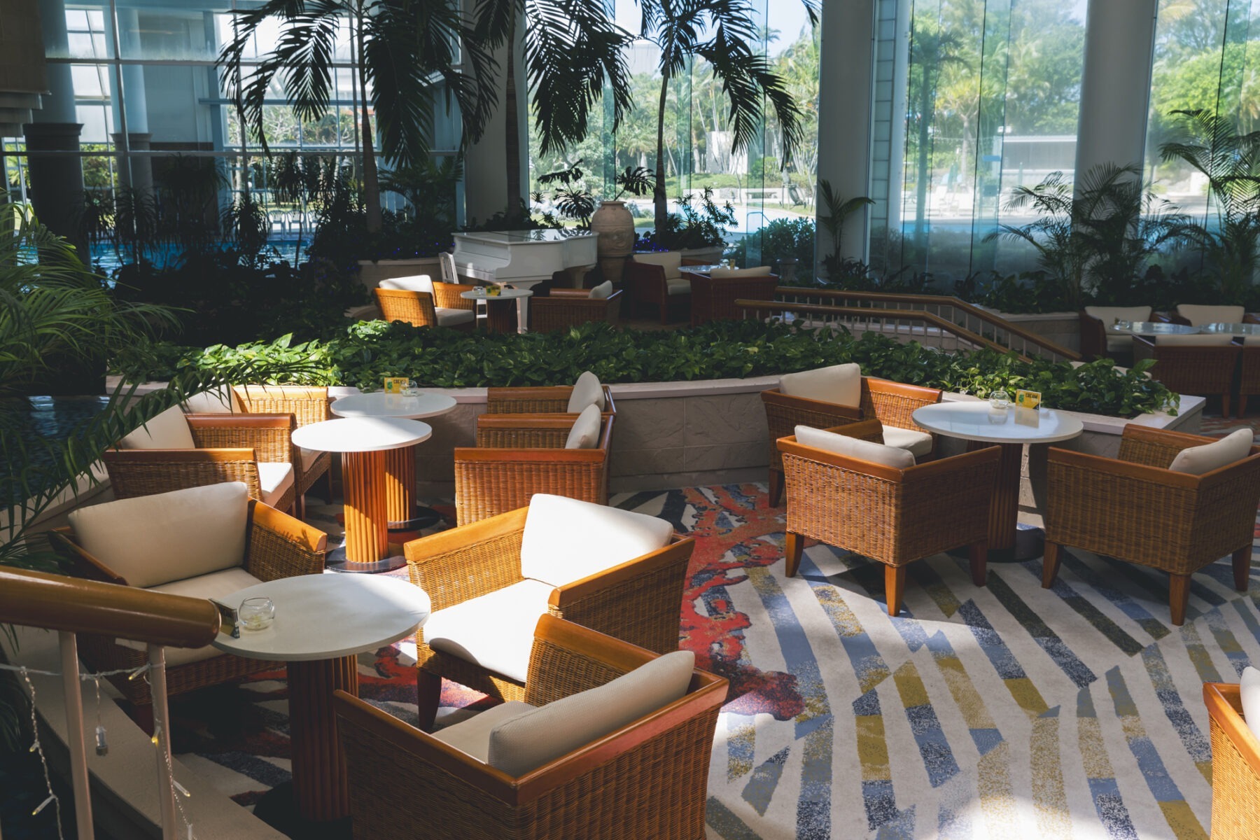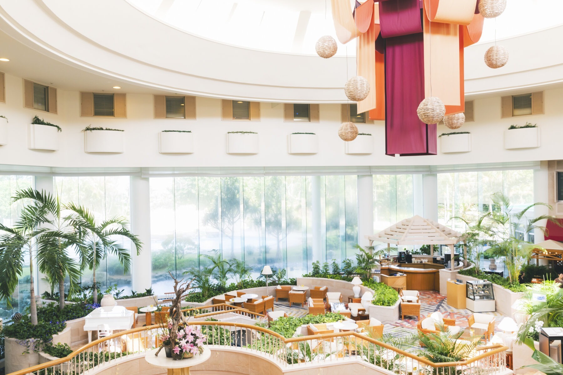 大きな吹き抜けに広がる緑と、ゆるやかに流れる水の音が心地よいラウンジは、リゾートにいることを改めて実感させてくれる場所。