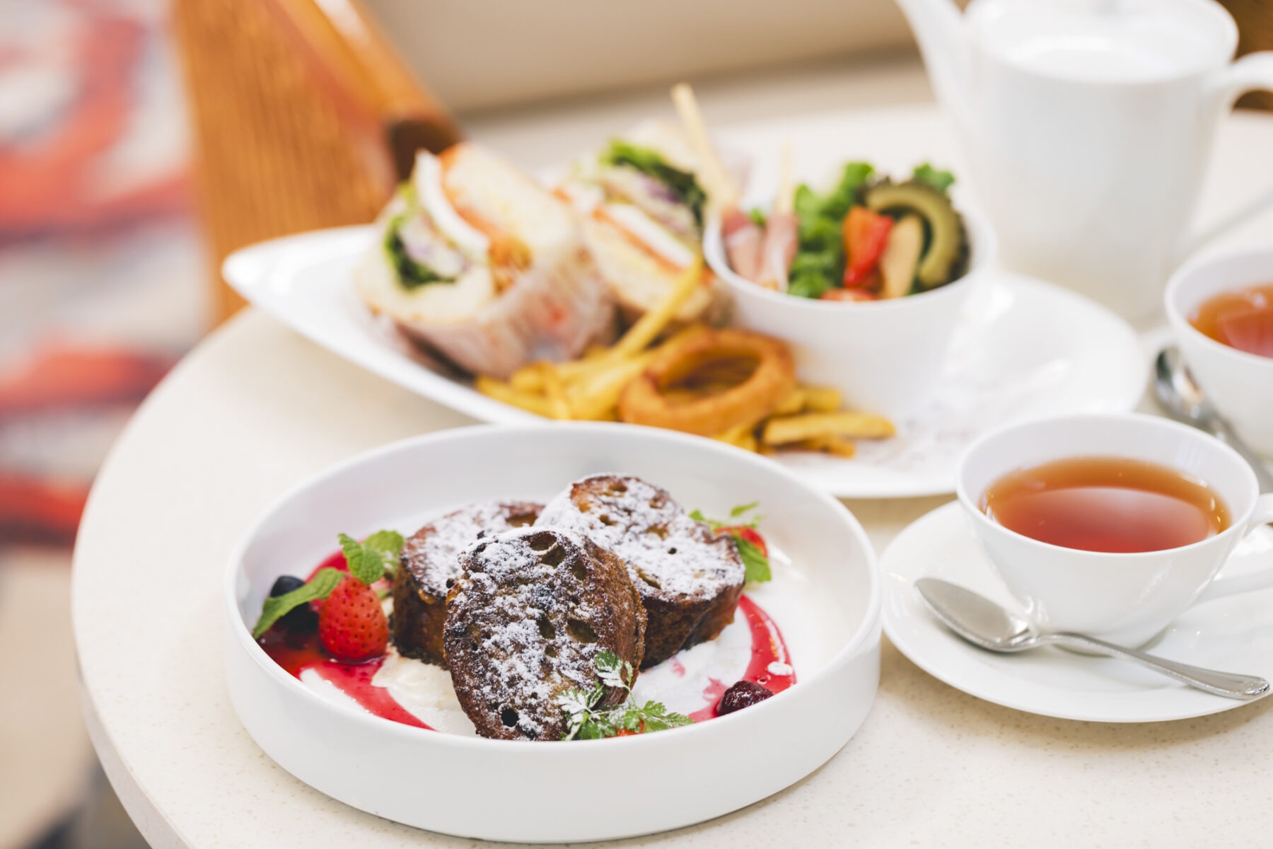 ドリンクや軽食に、人気のアフタヌーンティーは季節ごとに内容が変わり、訪れるたびに新たな楽しみを感じられます。