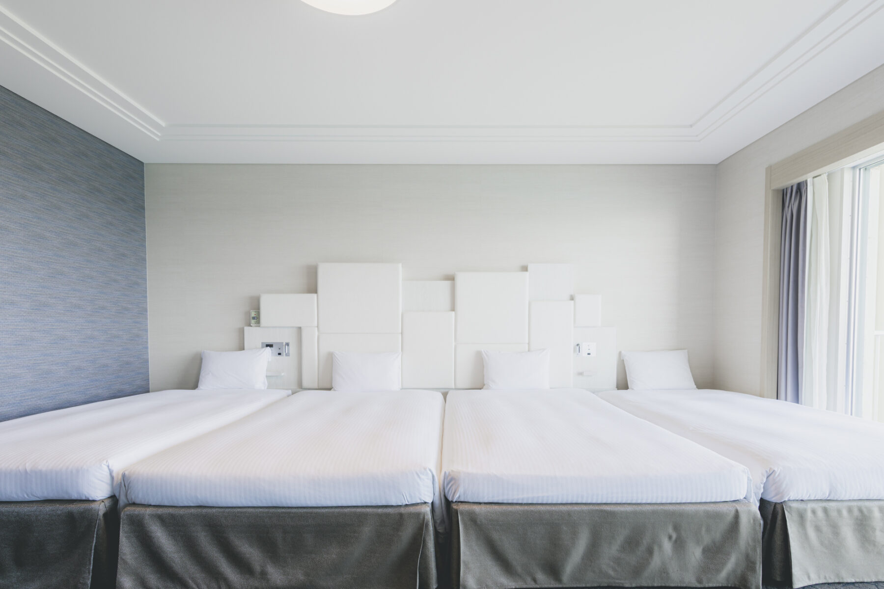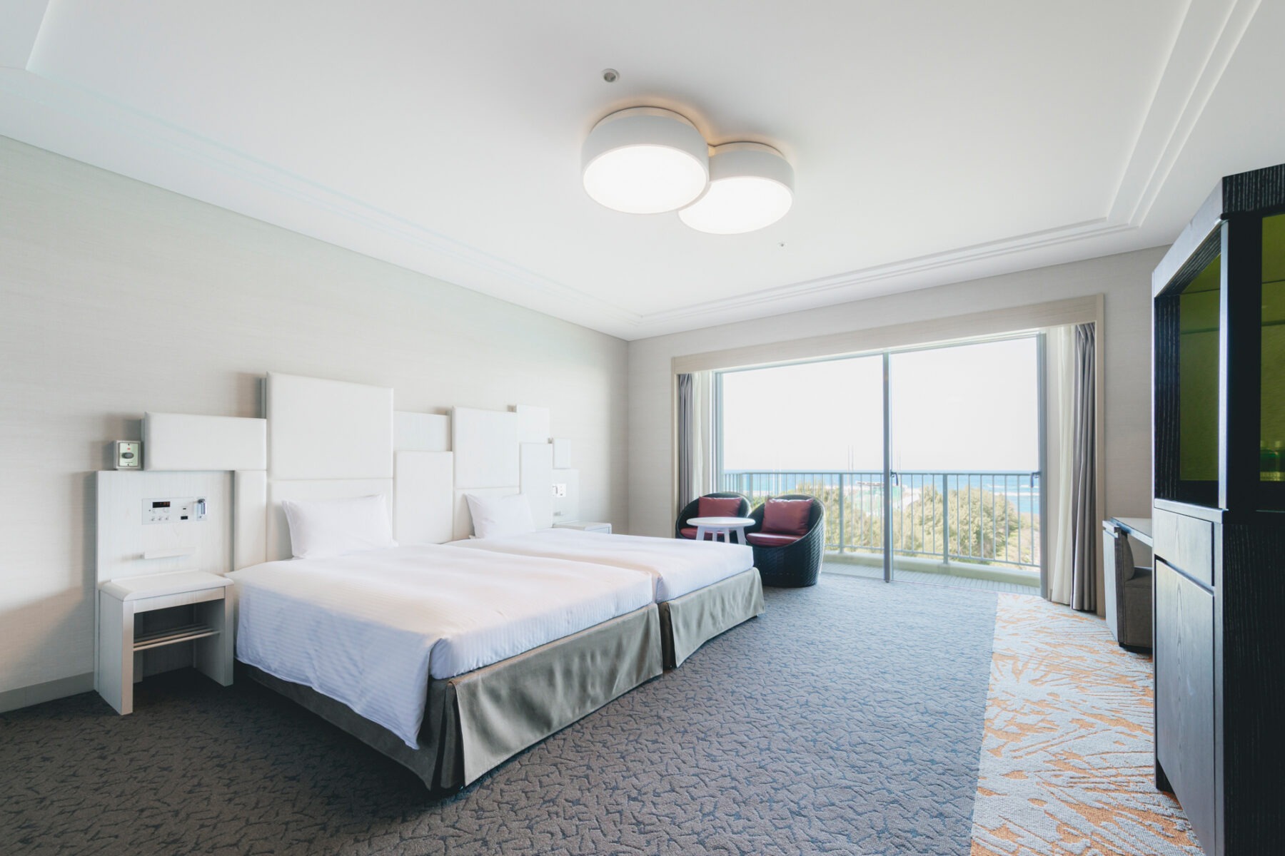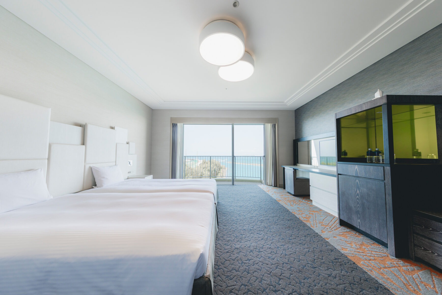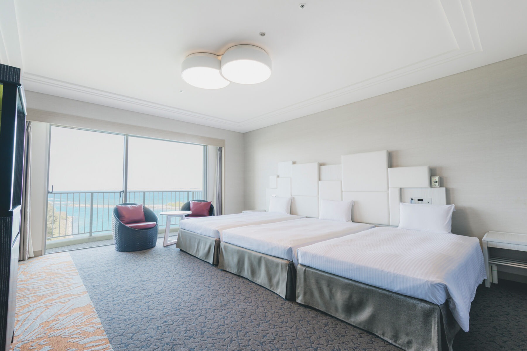最大4台までベッド設置が可能なオーシャンビューの絶景とモダンな客室。家族やグループでもゆったりと過ごせます。