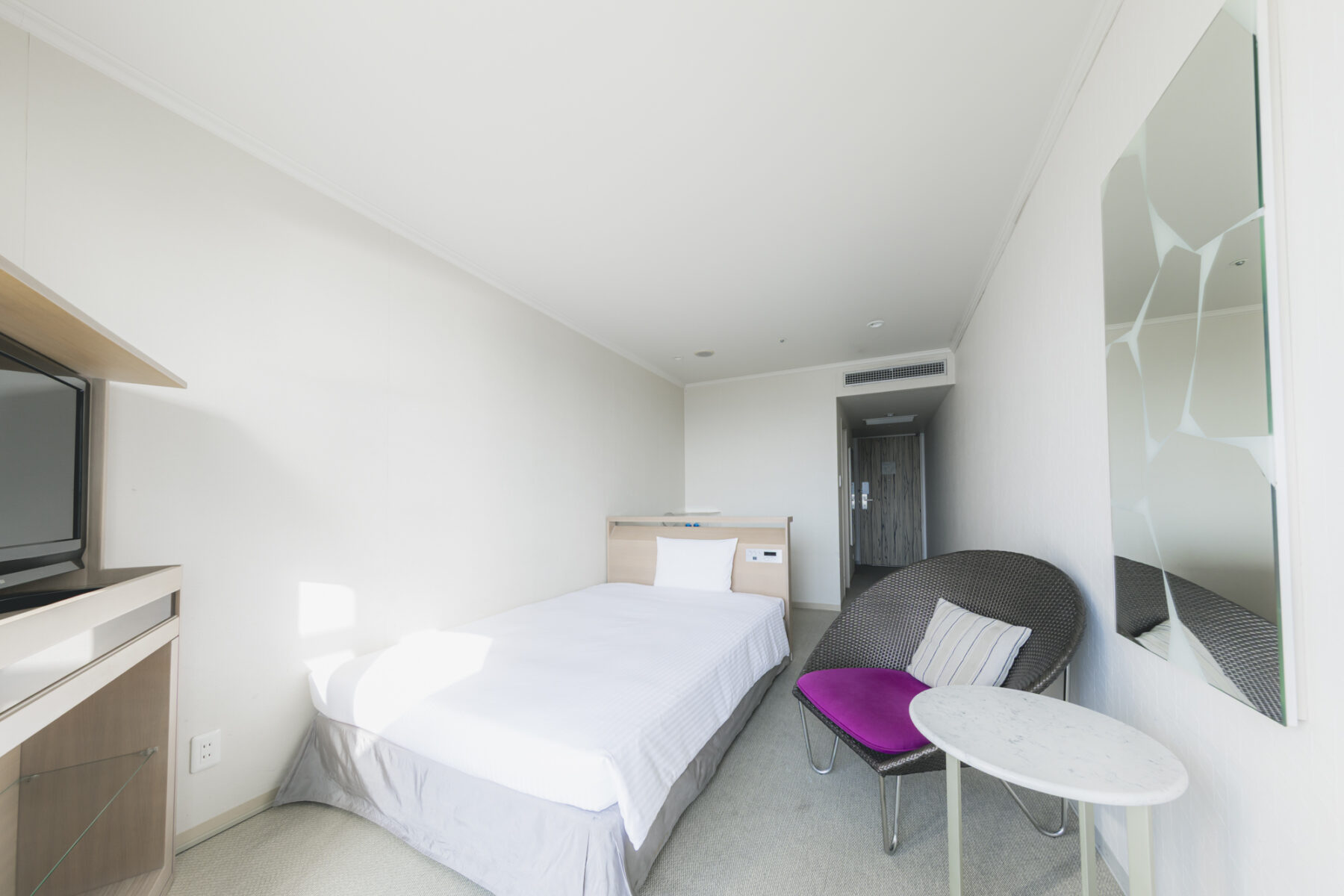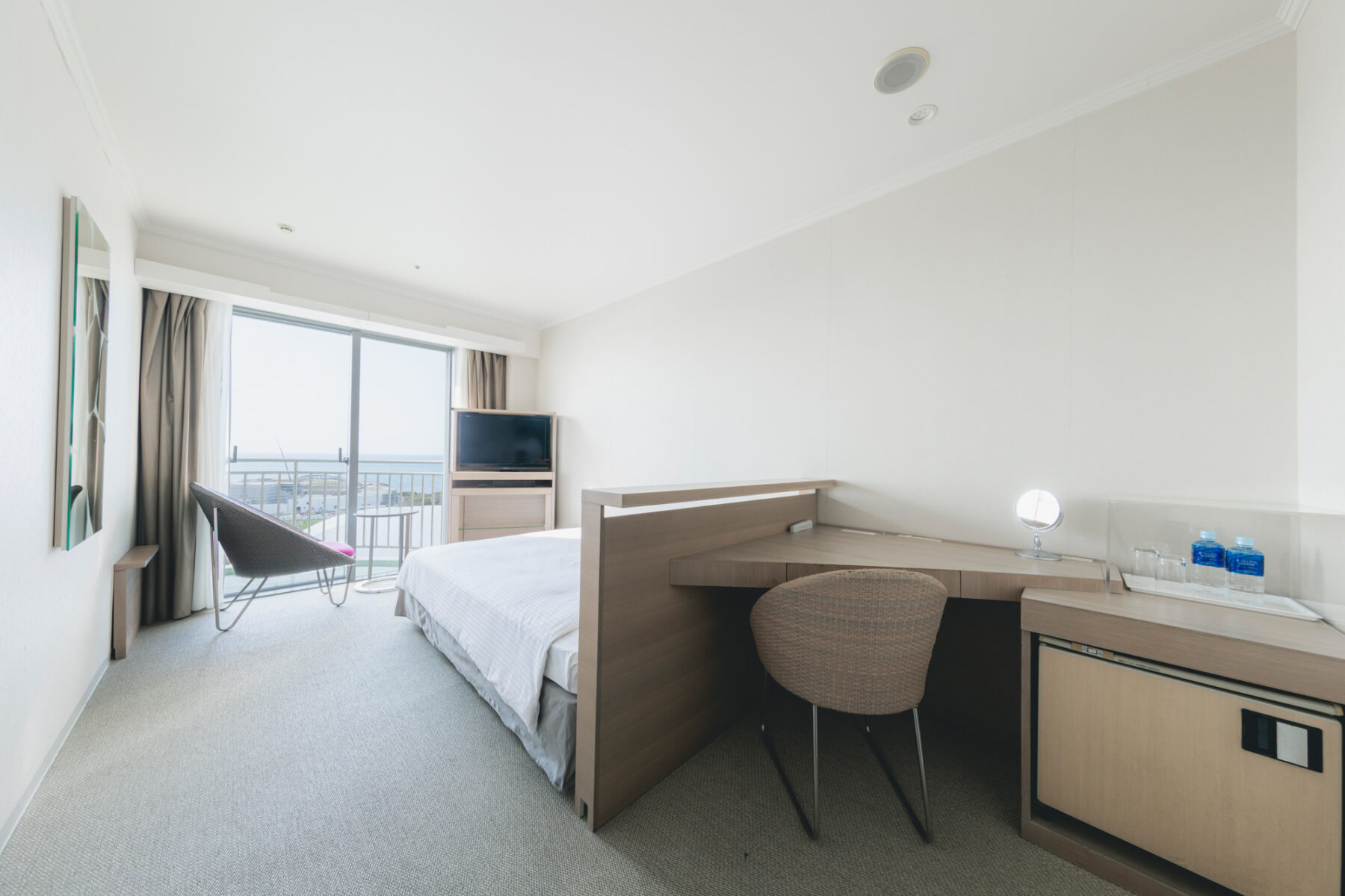 ベッドとデスクを備えた快適な空間。ひとり旅やビジネスシーンにも寄り添い心地よく整うひとときをお過ごしいただけます。