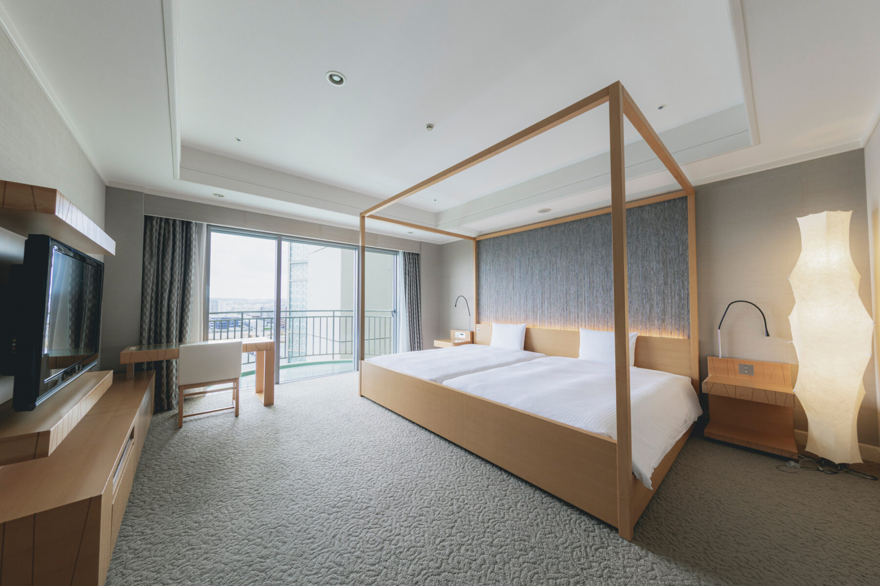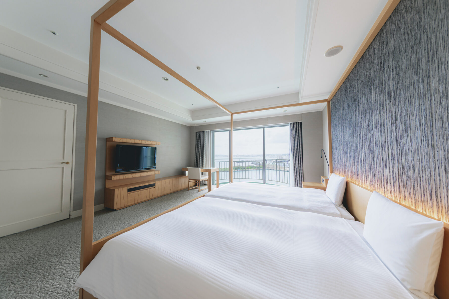 ゆとりある大きなベッドと窓からはやわらかな海風が吹き抜け。室内にいながらリゾートの開放感を感じられます。