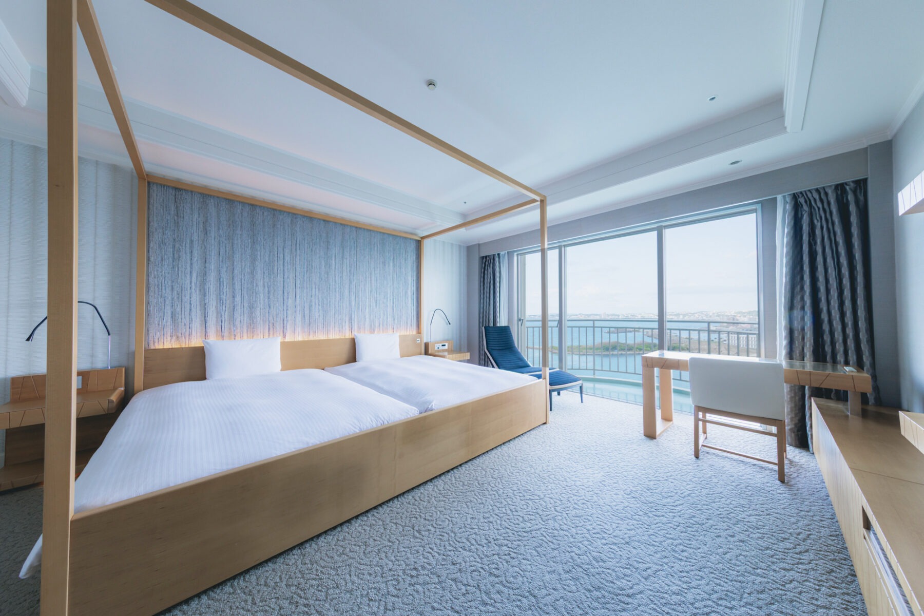 ゆとりある大きなベッドと窓からはやわらかな海風が吹き抜け