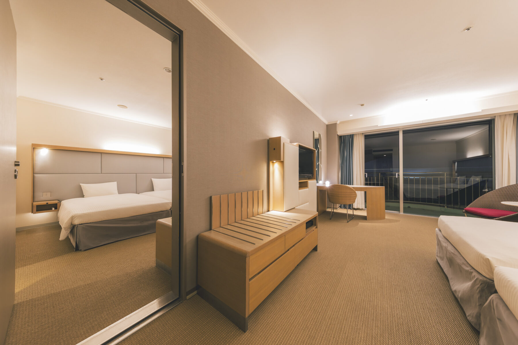 人数に応じたレイアウトで、最大4台までベッド設置が可能。ファミリーやグループでも快適に過ごせる柔軟な客室です。