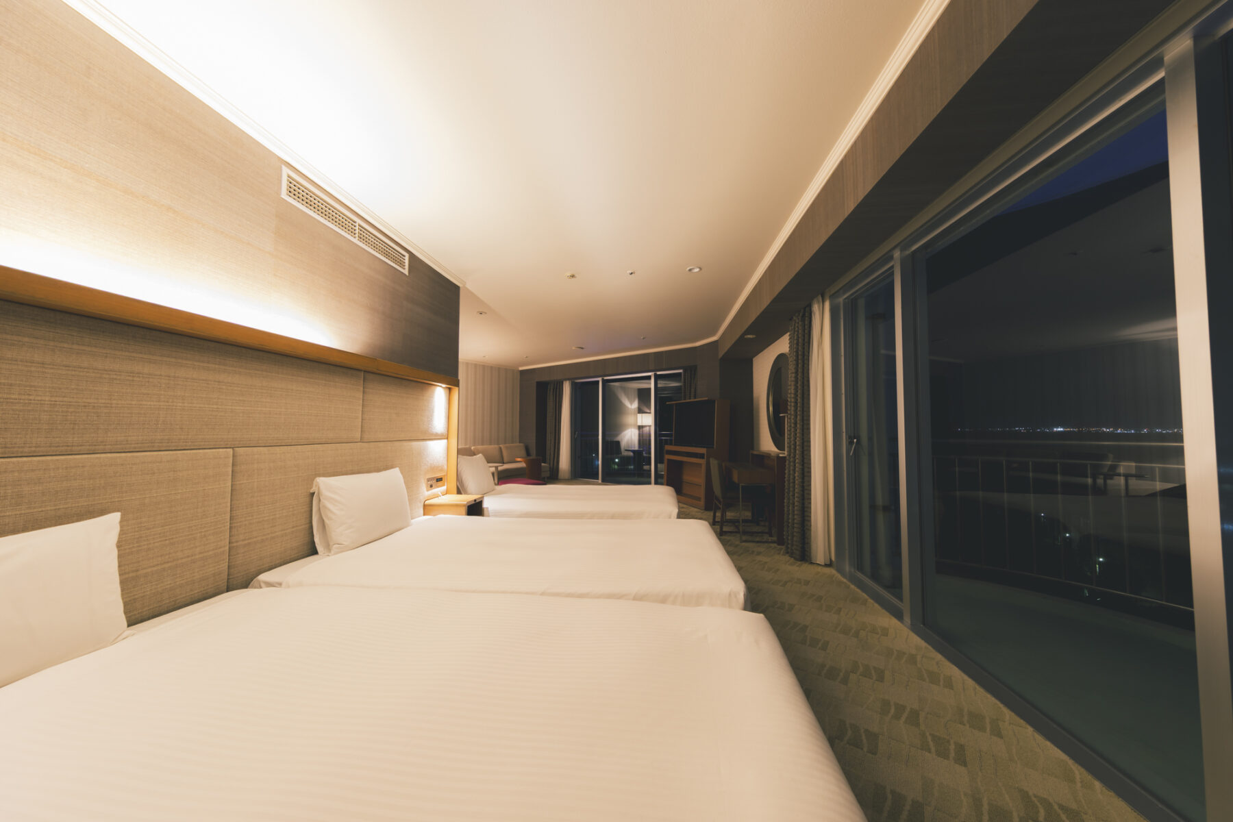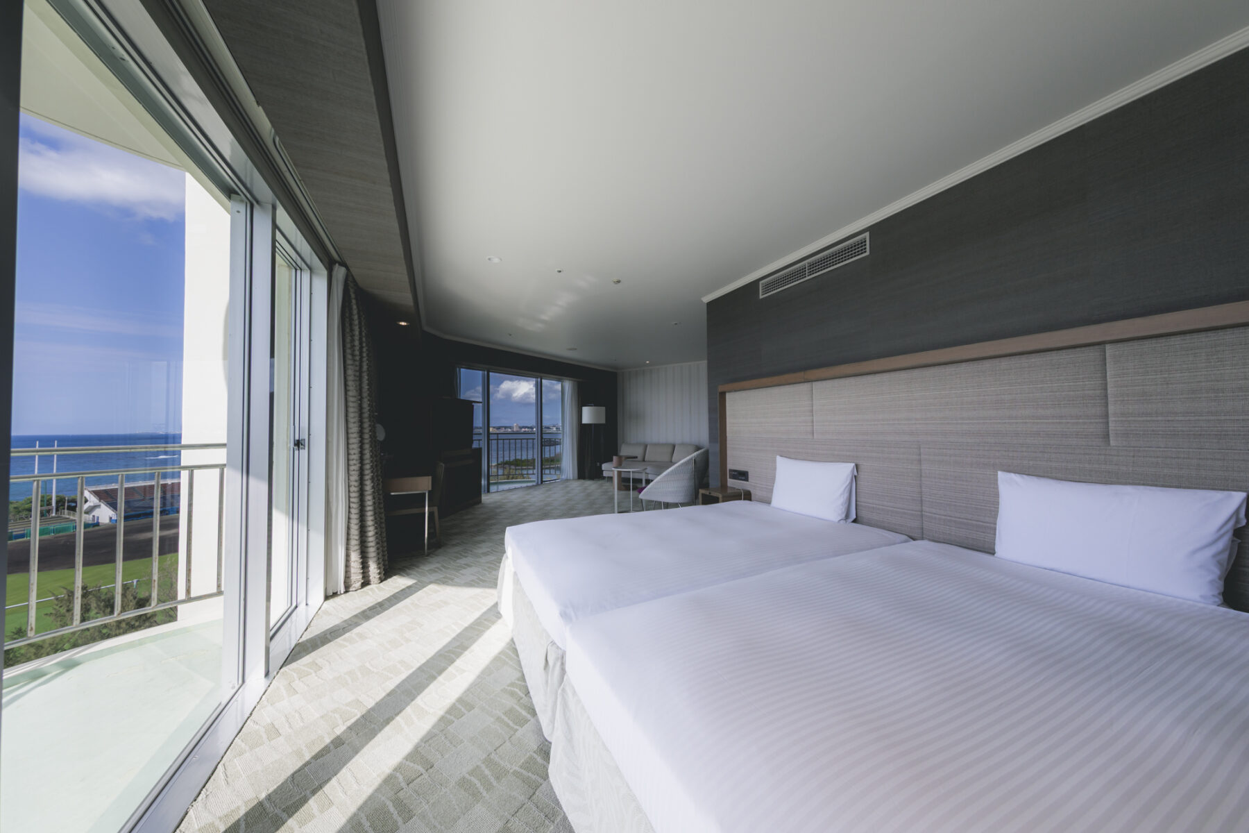 最大4台までベッド設置が可能なオーシャンビューの絶景とモダンな客室。